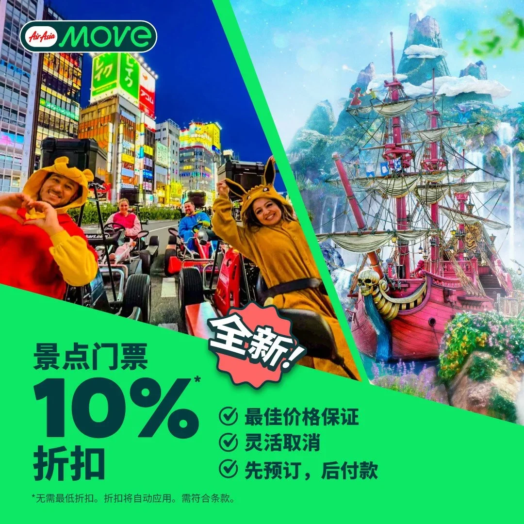 在 AirAsia MOVE 预订景点门票可享 10% 折扣